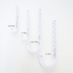 installation with design to allow various PVC pipe sizes to “snap” into place. Can also be used for hanging PVC pipe in central water filtration systems or overflow / drain to waste